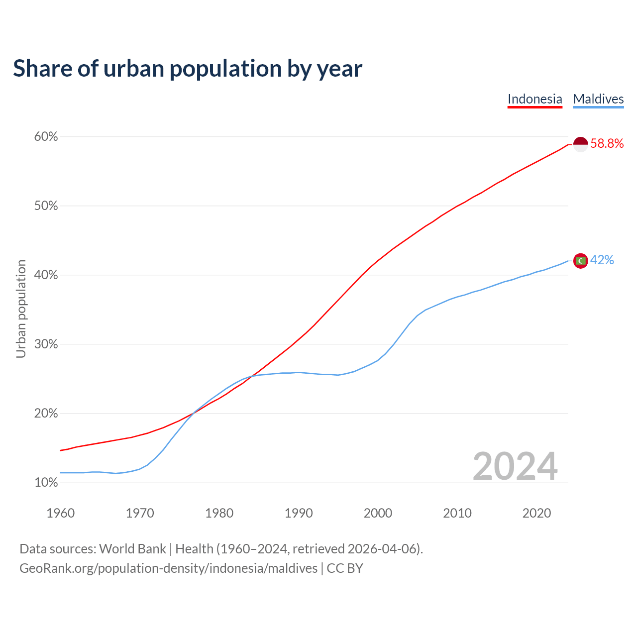 From 2004 to 2024, the share of urban population changed from 45.4% to 58.8% in Indonesia and from 32.9% to 42% in Maldives.