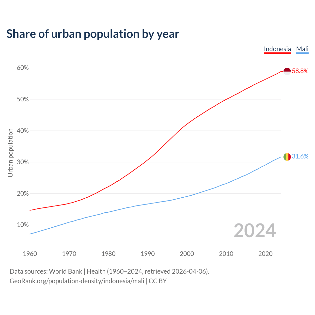 From 2004 to 2024, the share of urban population changed from 45.4% to 58.8% in Indonesia and from 20.5% to 31.6% in Mali.
