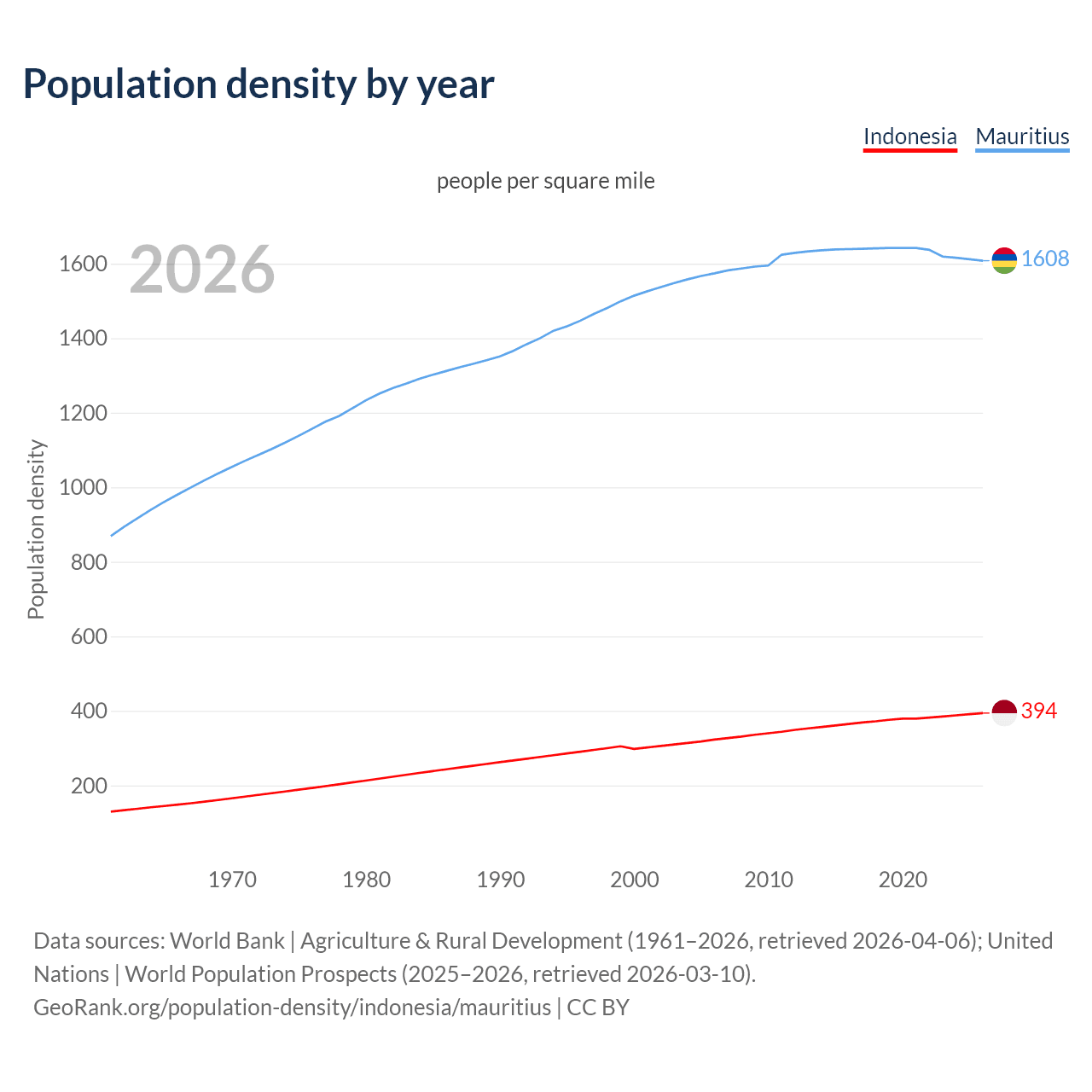 Indonesia has a population density of 394 people per square mile compared to 1,608 people in Mauritius. Indonesia has 72,316 sq ft of land per person vs 17,626 sq ft in Mauritius. Indonesia and Mauritius rank 64th and 11th by population density, respectively.