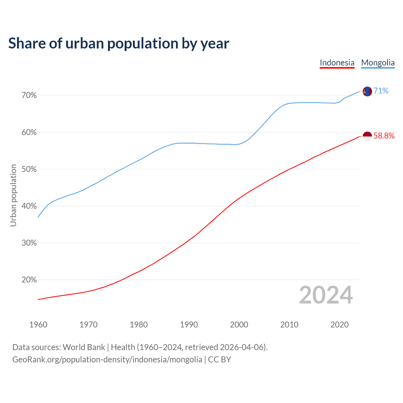 From 2004 to 2024, the share of urban population changed from 45.4% to 58.8% in Indonesia and from 60.8% to 71% in Mongolia.