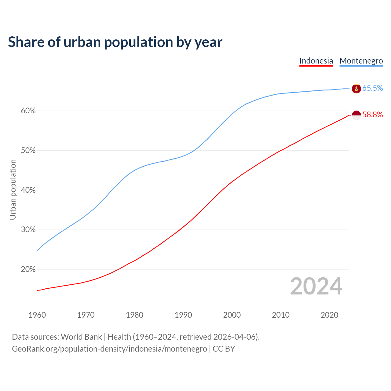 From 2004 to 2024, the share of urban population changed from 45.4% to 58.8% in Indonesia and from 62.2% to 65.5% in Montenegro.