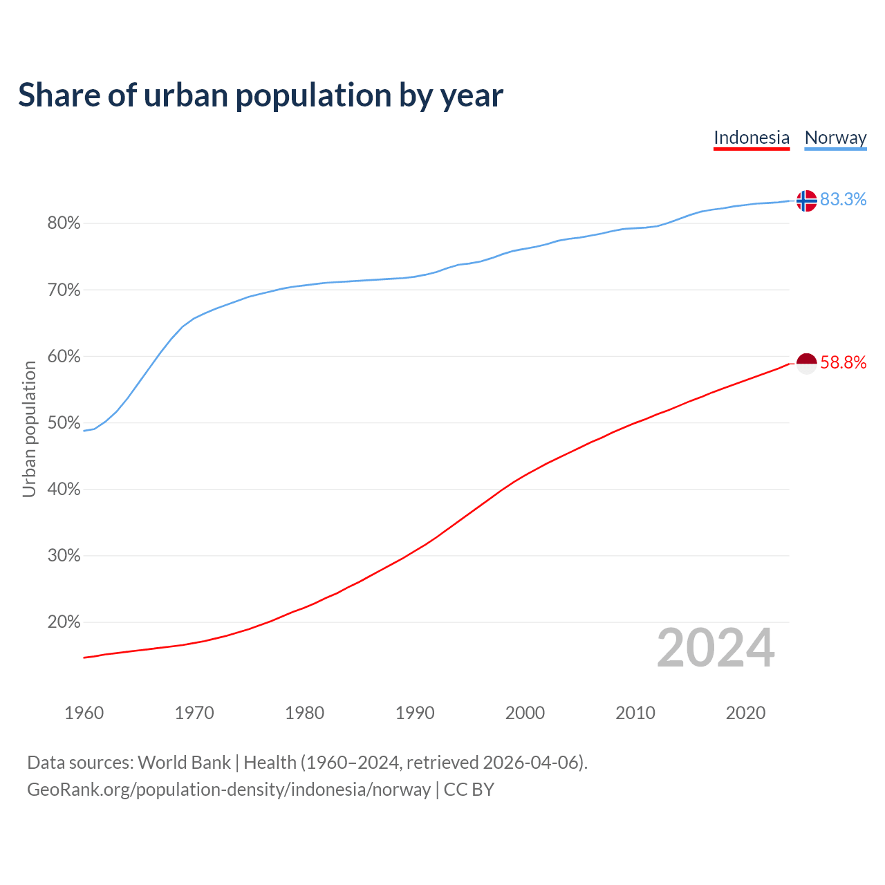 From 2004 to 2024, the share of urban population changed from 45.4% to 58.8% in Indonesia and from 77.6% to 83.3% in Norway.