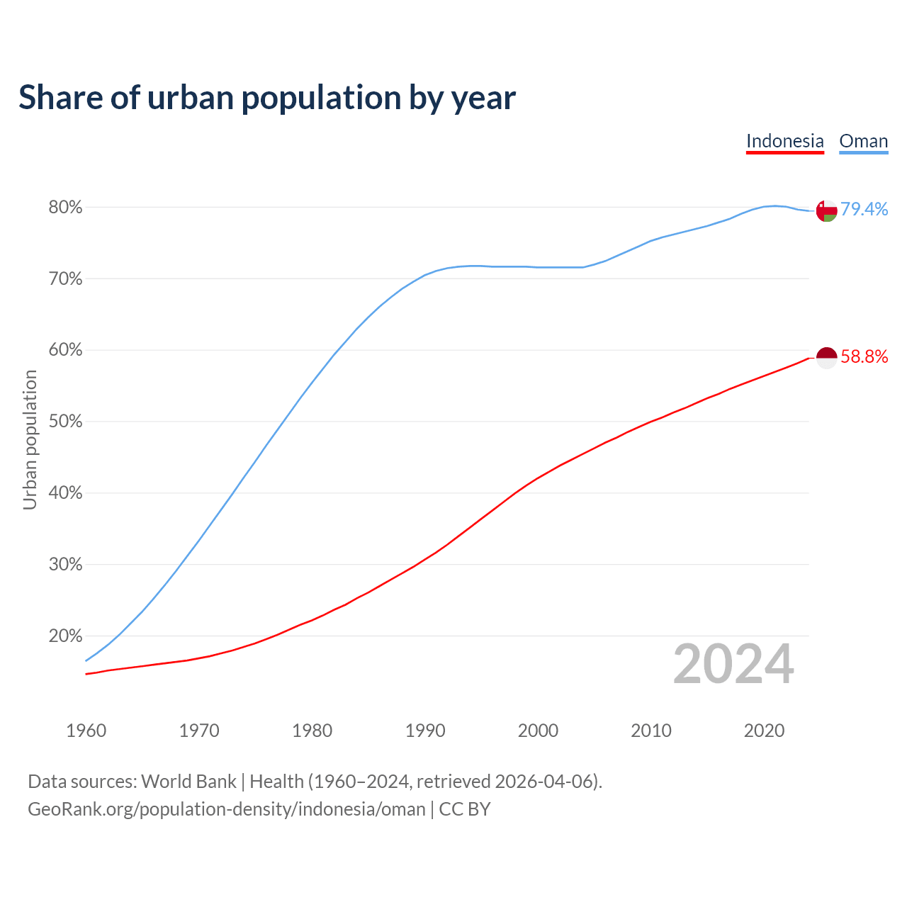 From 2004 to 2024, the share of urban population changed from 45.4% to 58.8% in Indonesia and from 71.5% to 79.4% in Oman.