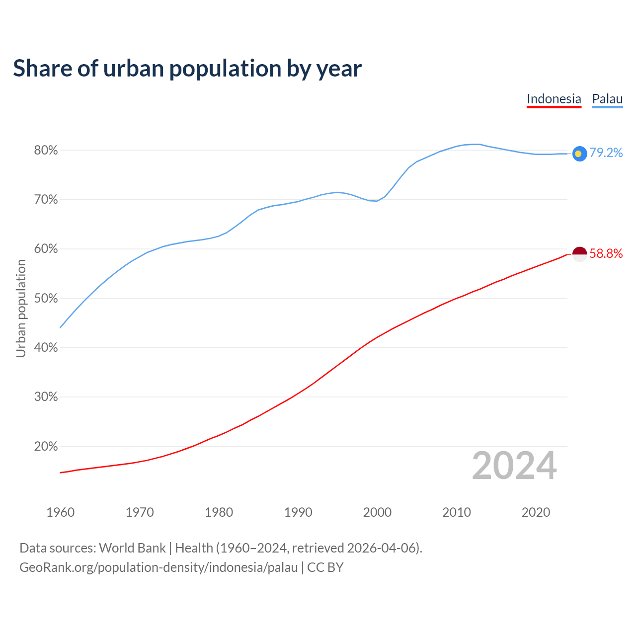 From 2004 to 2024, the share of urban population changed from 45.4% to 58.8% in Indonesia and from 76.4% to 79.2% in Palau.