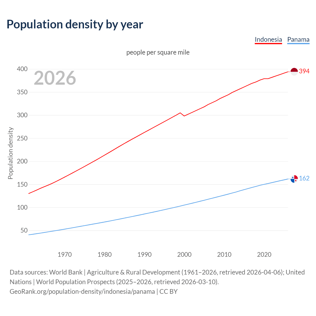 From 2006 to 2026, population density in Indonesia increased by 22.1%, compared to a 37.4% growth in Panama.