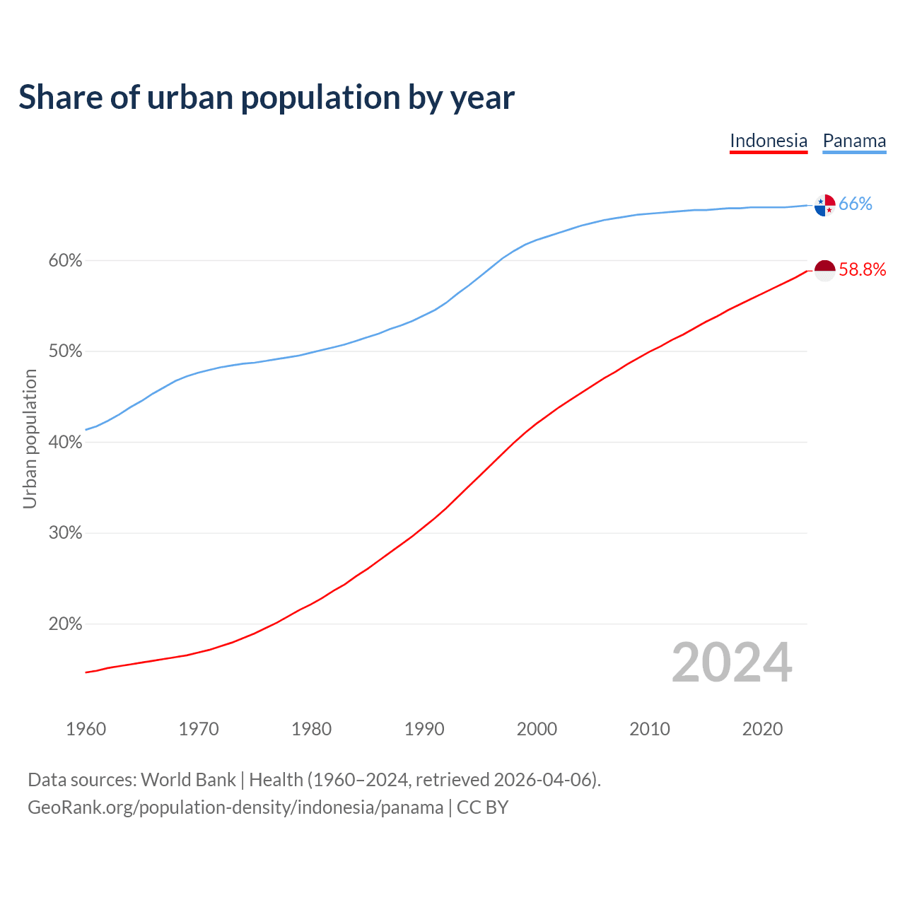 From 2004 to 2024, the share of urban population changed from 45.4% to 58.8% in Indonesia and from 63.8% to 66% in Panama.