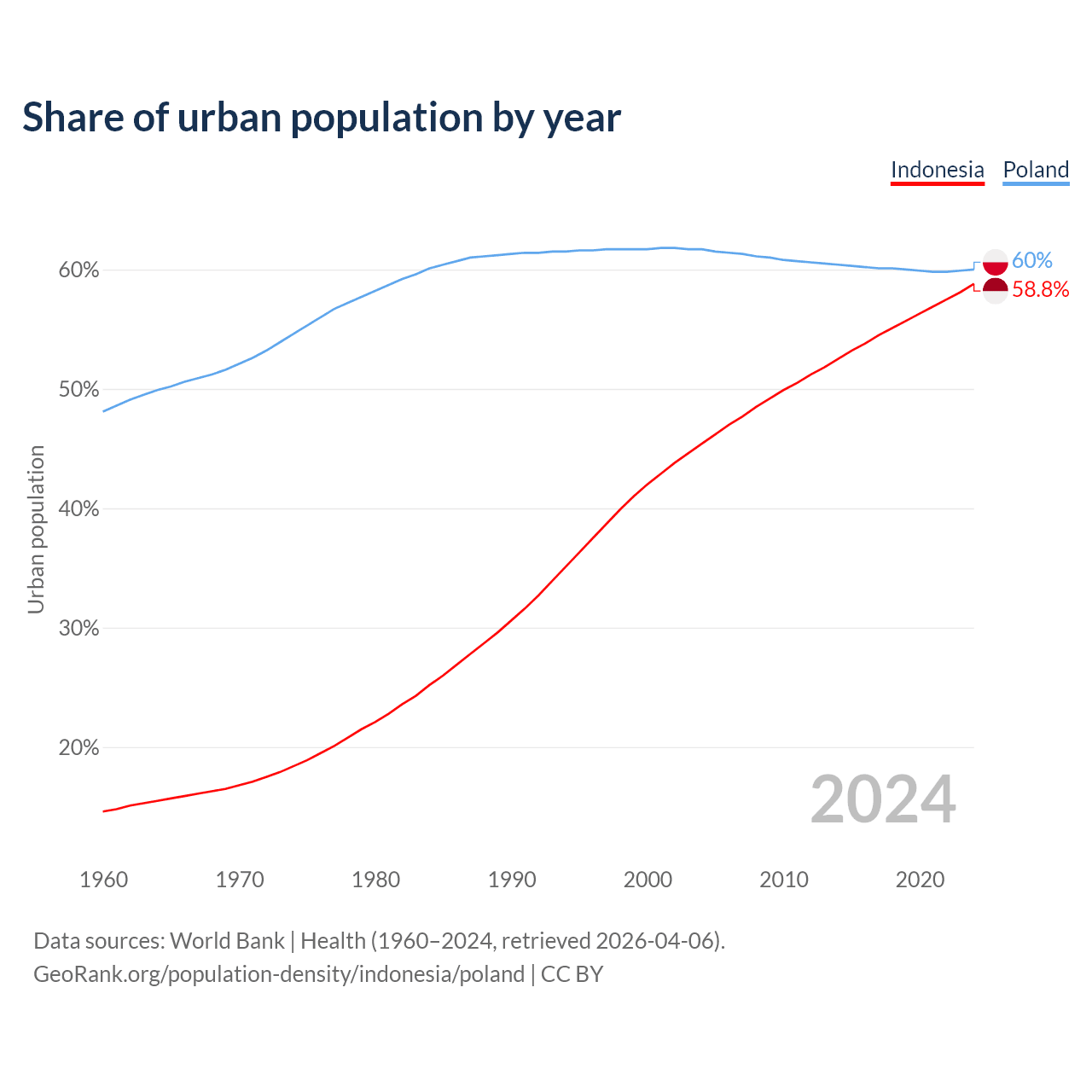 From 2004 to 2024, the share of urban population changed from 45.4% to 58.8% in Indonesia and from 61.7% to 60% in Poland.
