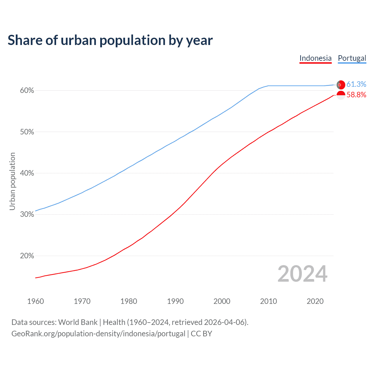 From 2004 to 2024, the share of urban population changed from 45.4% to 58.8% in Indonesia and from 57.4% to 61.3% in Portugal.