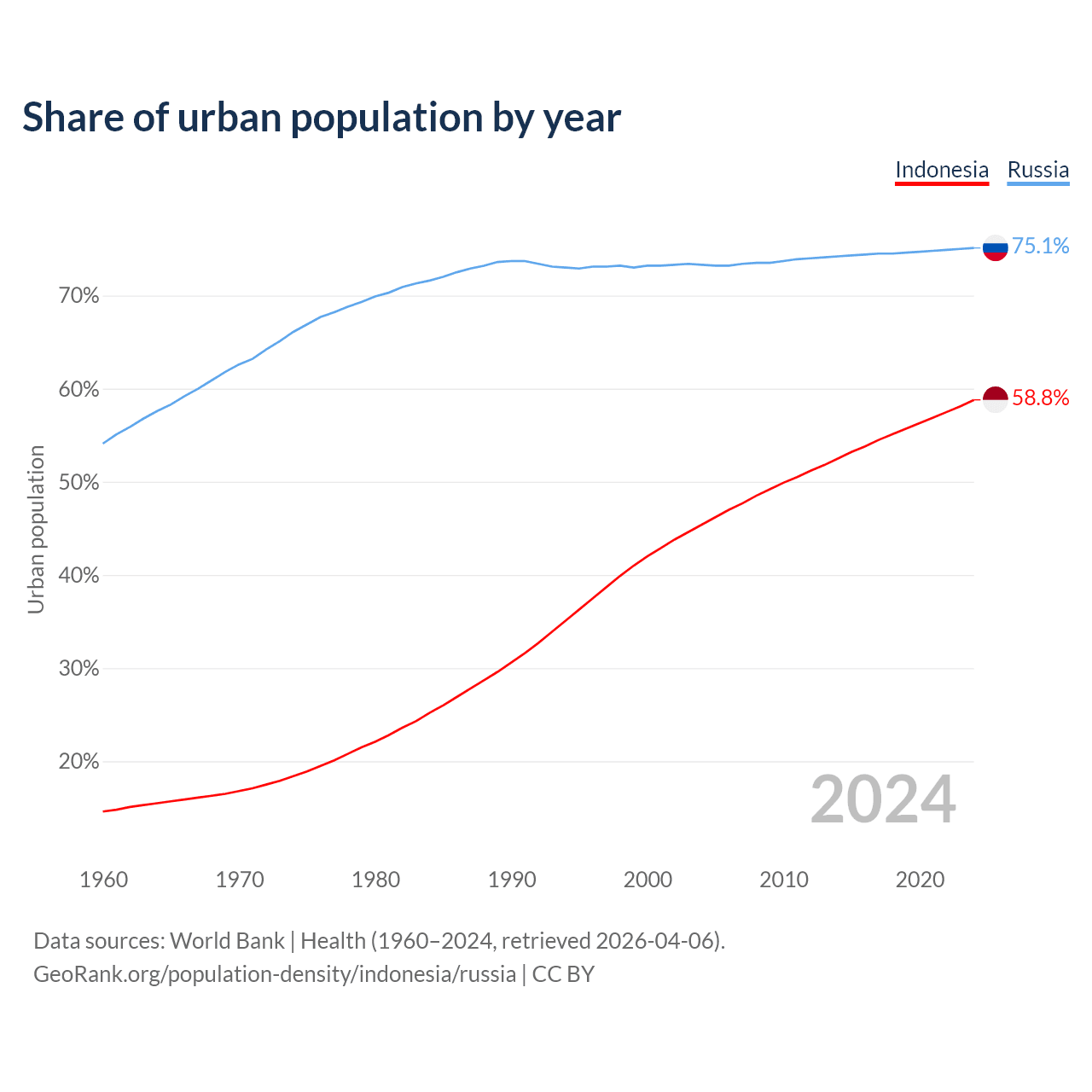From 2004 to 2024, the share of urban population changed from 45.4% to 58.8% in Indonesia and from 73.3% to 75.1% in Russia.