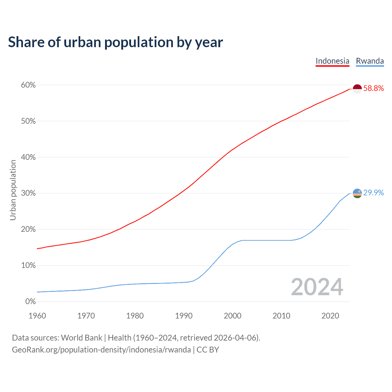 From 2004 to 2024, the share of urban population changed from 45.4% to 58.8% in Indonesia and from 16.9% to 29.9% in Rwanda.