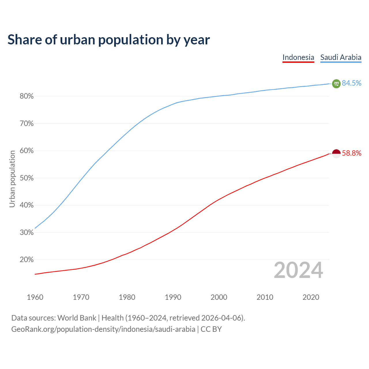 From 2004 to 2024, the share of urban population changed from 45.4% to 58.8% in Indonesia and from 80.8% to 84.5% in Saudi Arabia.
