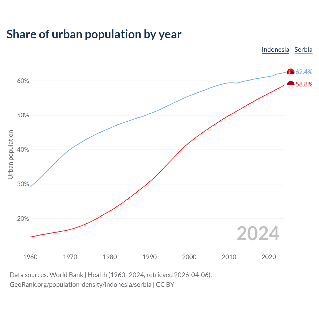 From 2004 to 2024, the share of urban population changed from 45.4% to 58.8% in Indonesia and from 57.3% to 62.4% in Serbia.