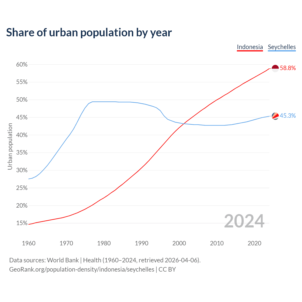 From 2004 to 2024, the share of urban population changed from 45.4% to 58.8% in Indonesia and from 42.9% to 45.3% in the Seychelles.