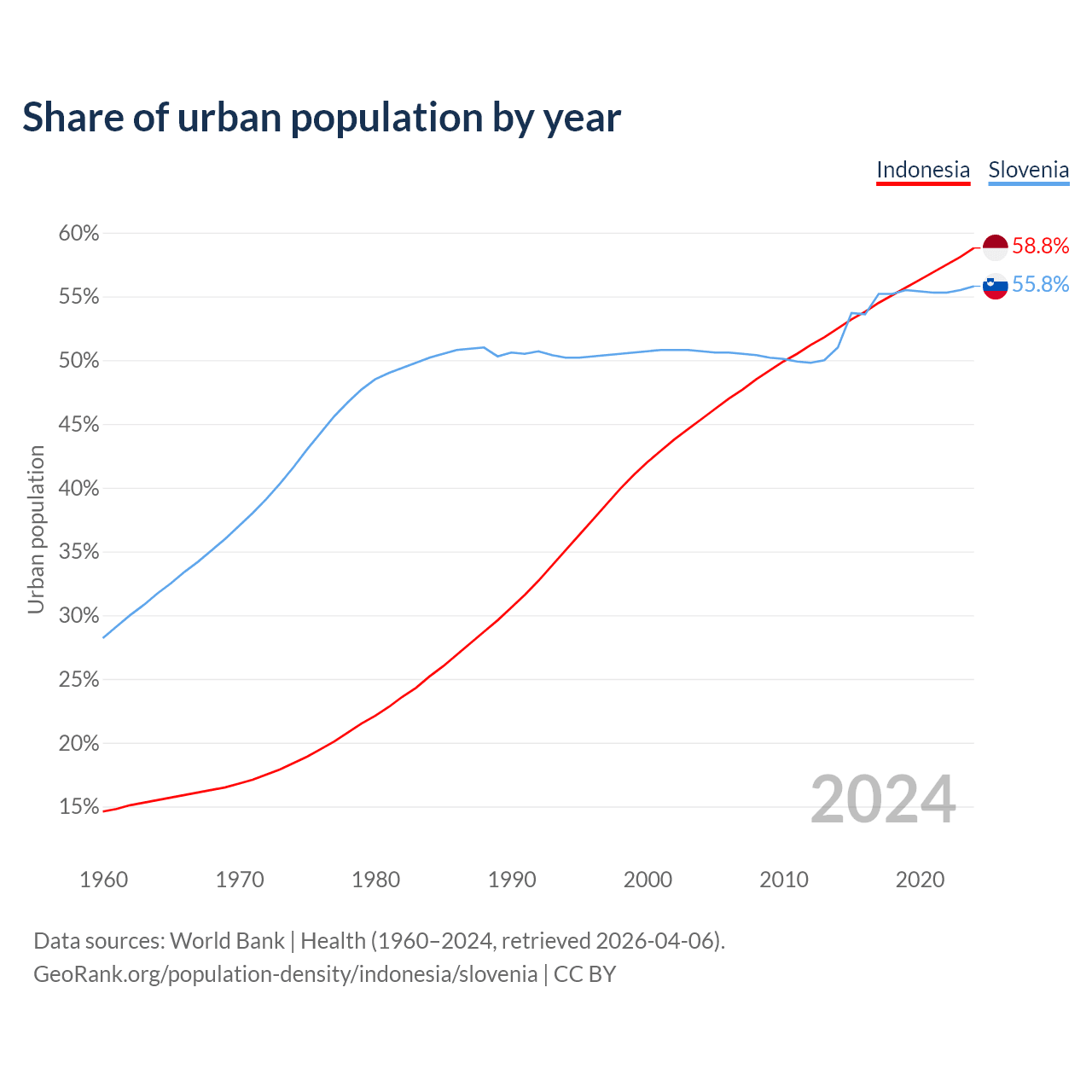 From 2004 to 2024, the share of urban population changed from 45.4% to 58.8% in Indonesia and from 50.7% to 55.8% in Slovenia.