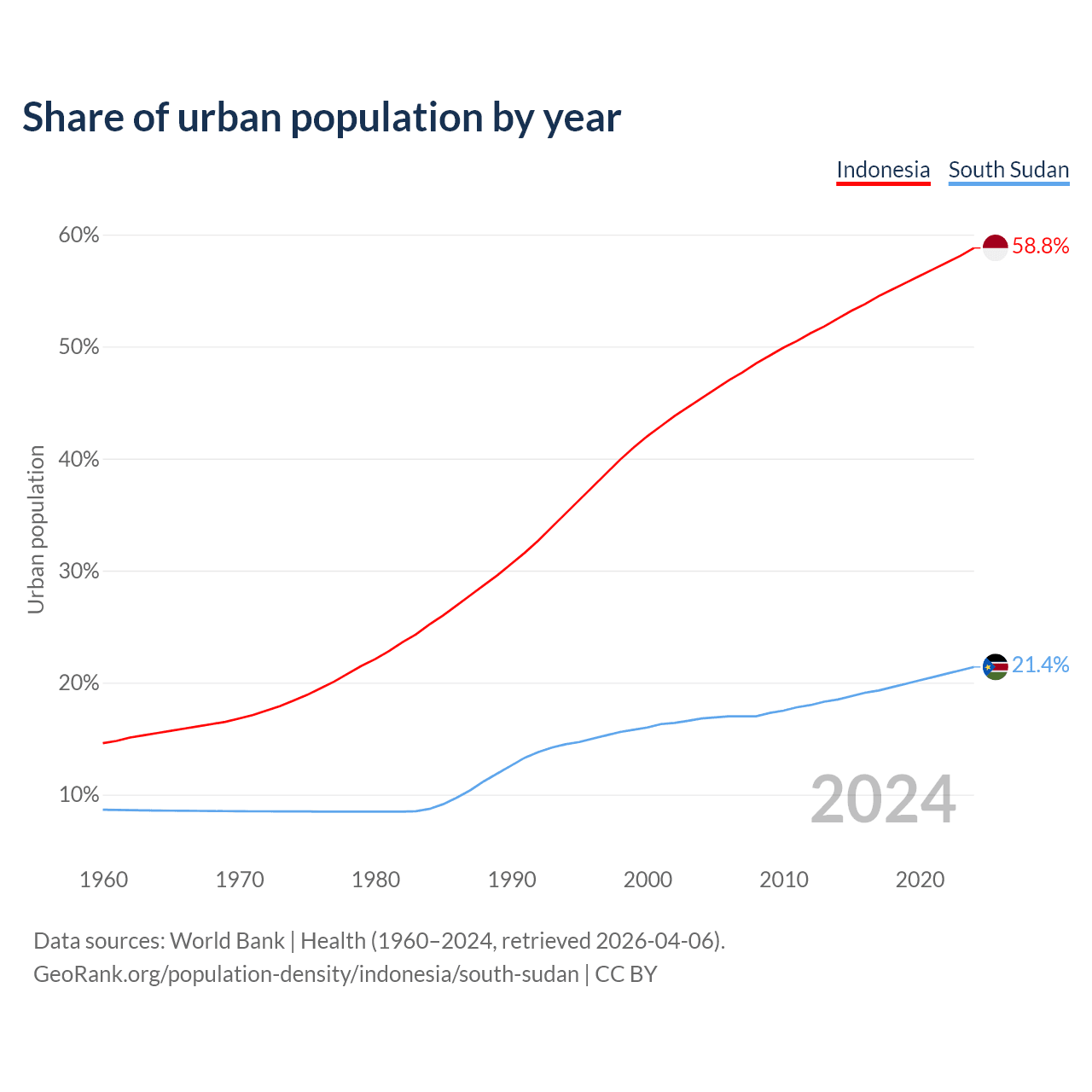 From 2004 to 2024, the share of urban population changed from 45.4% to 58.8% in Indonesia and from 16.8% to 21.4% in South Sudan.