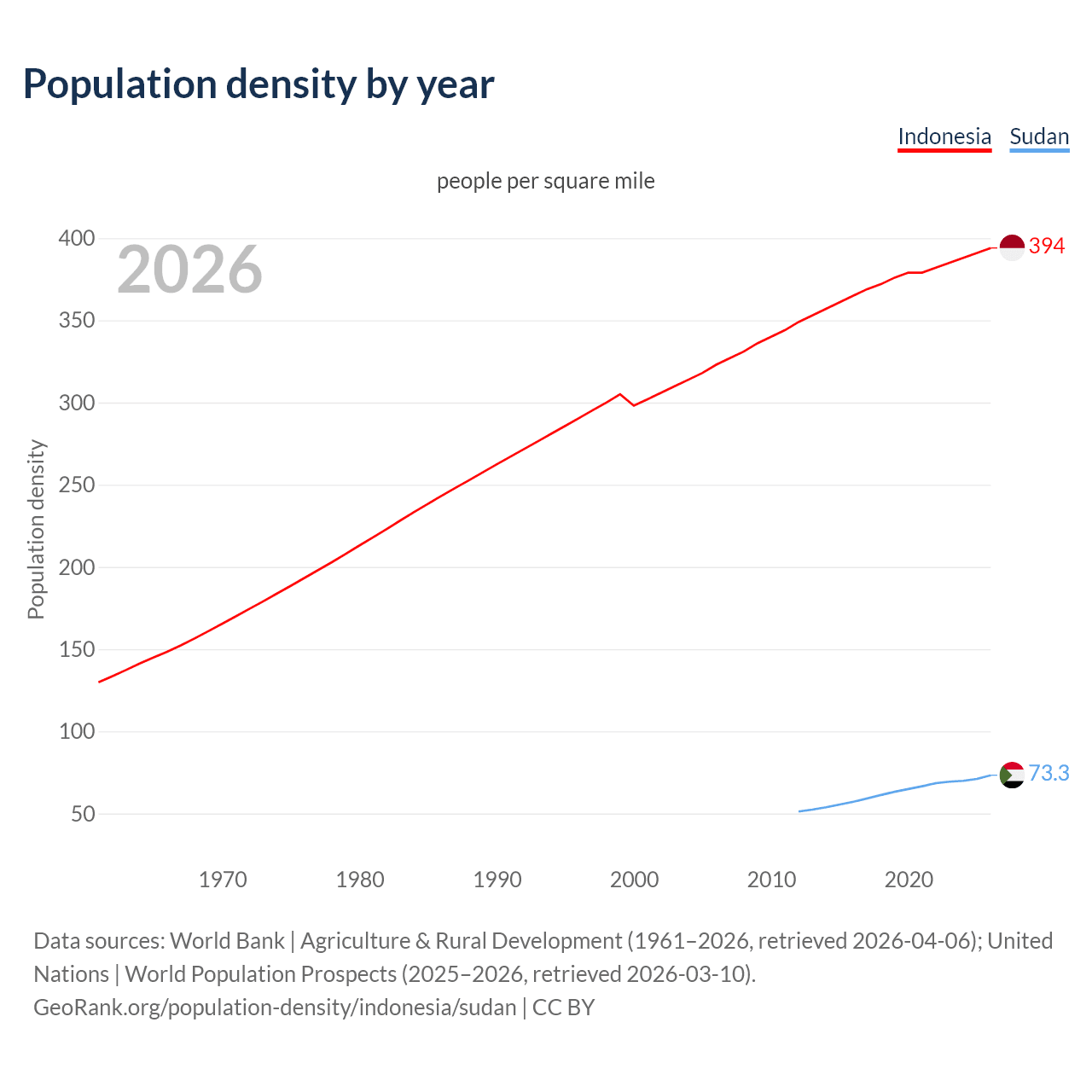 From 2012 to 2026, population density in Indonesia increased by 13.1%, compared to a 43.3% growth in Sudan.