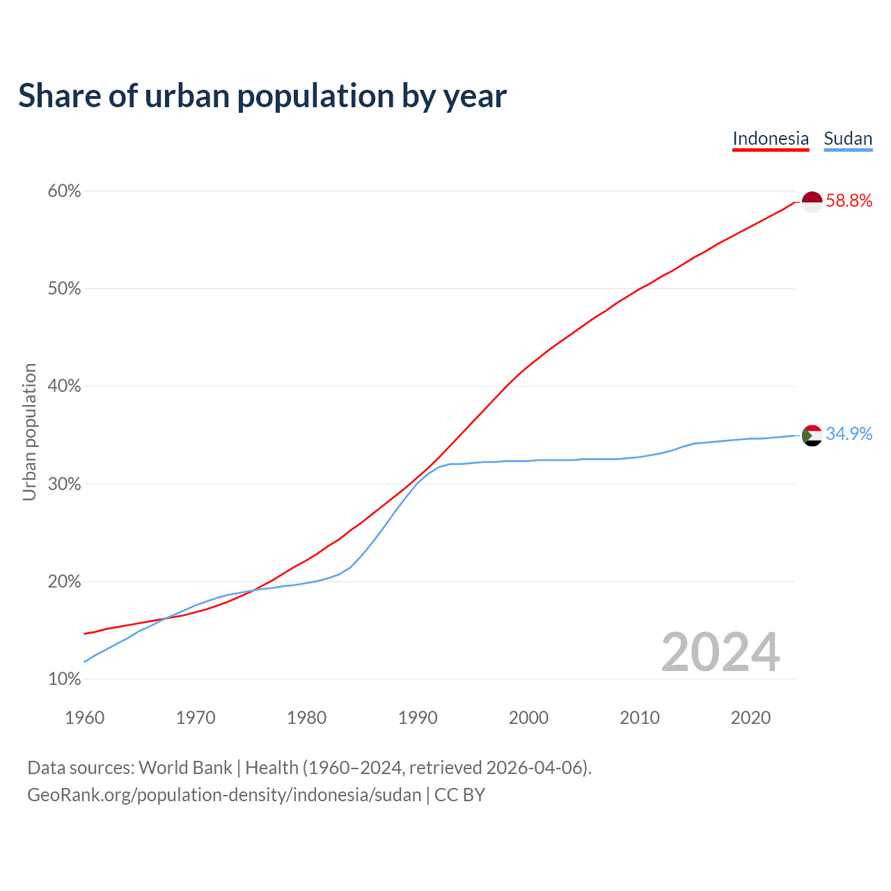 From 2004 to 2024, the share of urban population changed from 45.4% to 58.8% in Indonesia and from 32.4% to 34.9% in Sudan.