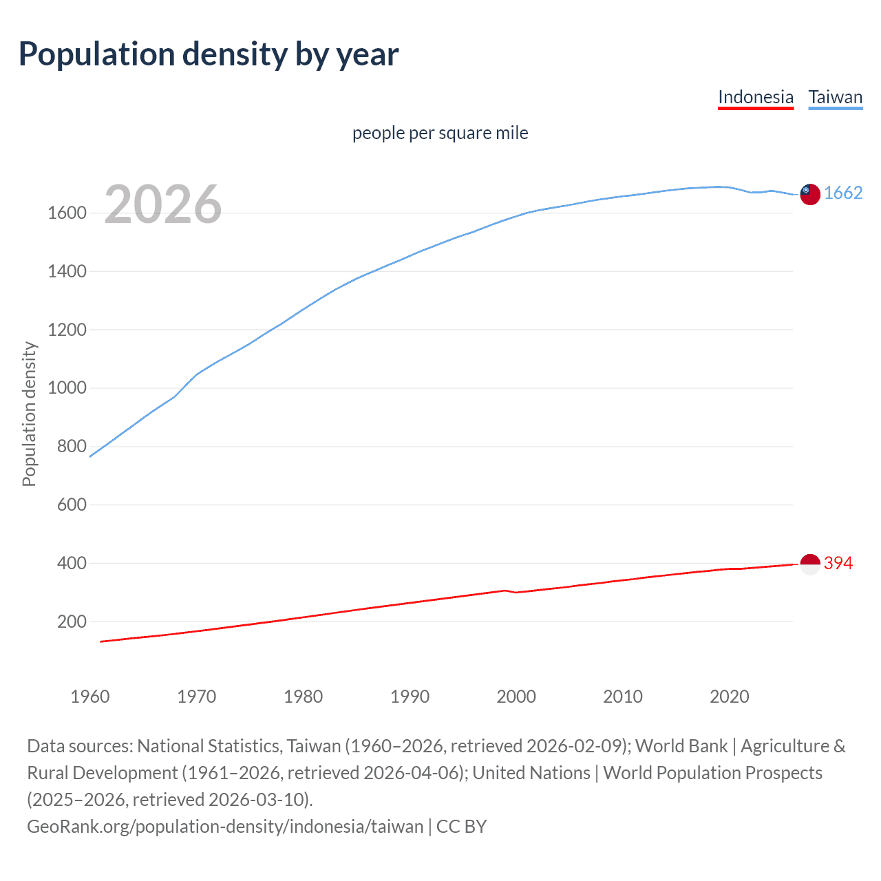 Data sources: World Bank | Agriculture & Rural Development (1961–2026, retrieved 2026-04-06); United Nations | World Population Prospects (1961–2026, retrieved 2026-03-10); National Statistics, Taiwan (1961–2026, retrieved 2026-02-09); U.S. Census Bureau (1961–2025, retrieved 2026-02-08); Central Intelligence Agency (CIA) (2000–2019, retrieved 2026-02-20).