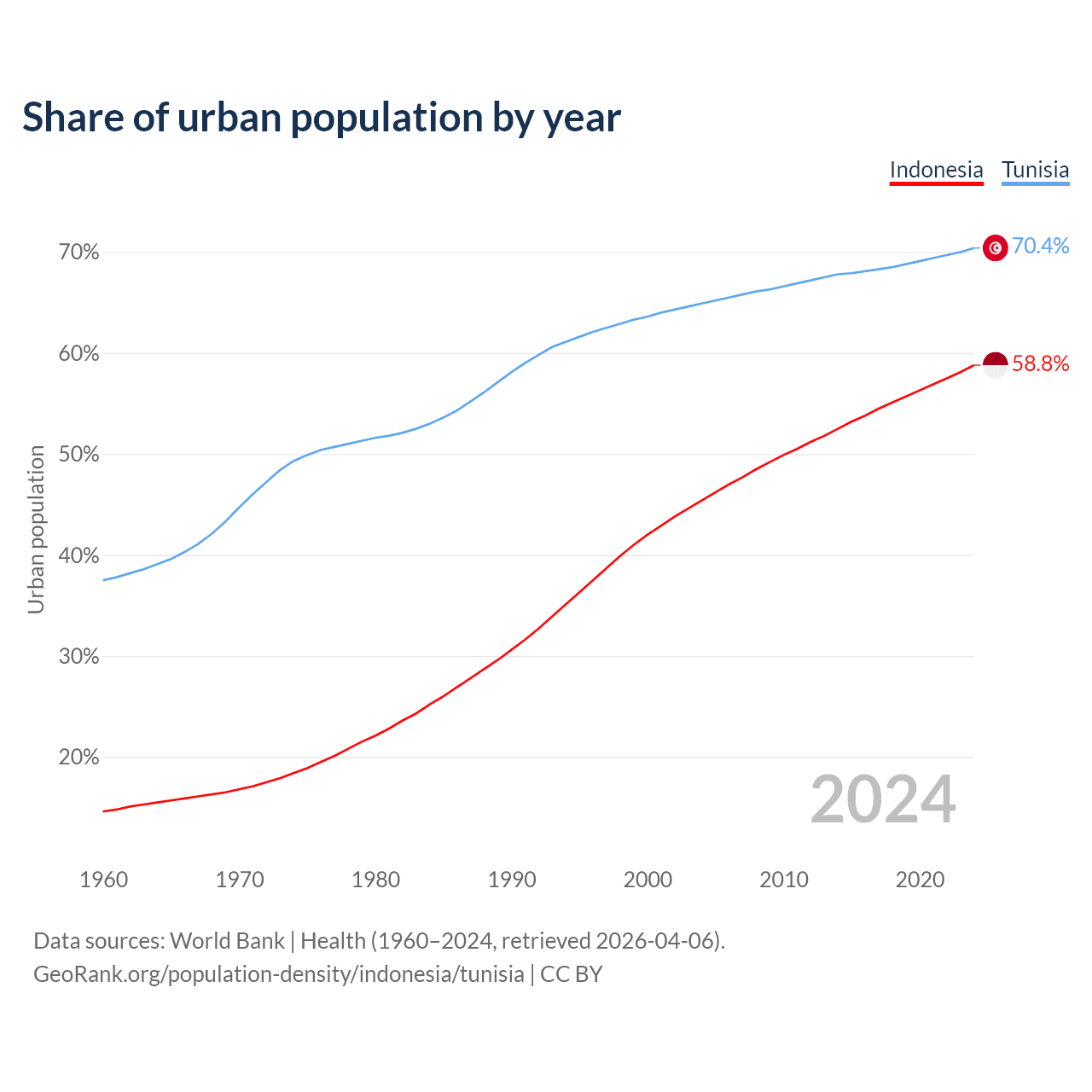 From 2004 to 2024, the share of urban population changed from 45.4% to 58.8% in Indonesia and from 64.9% to 70.4% in Tunisia.
