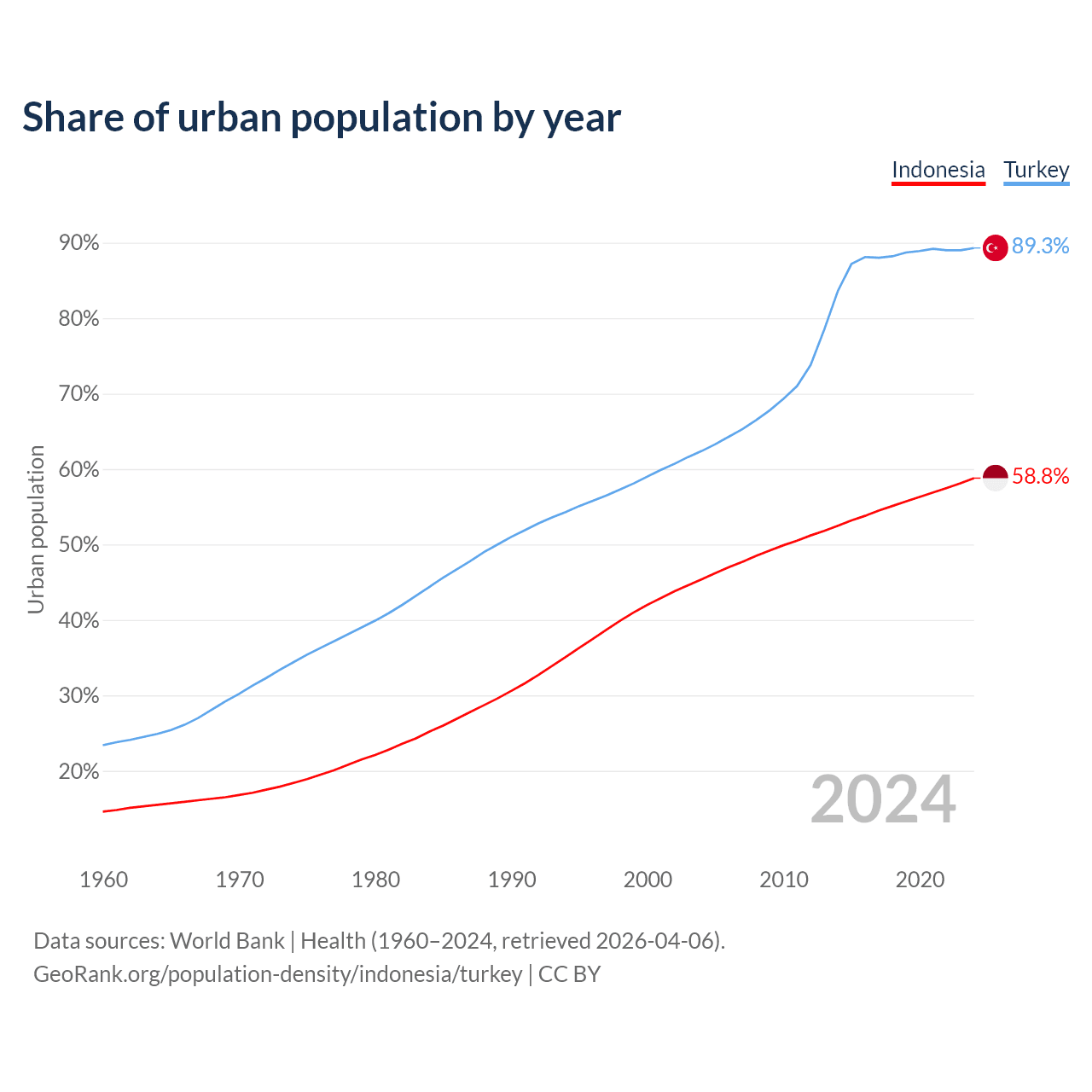 From 2004 to 2024, the share of urban population changed from 45.4% to 58.8% in Indonesia and from 62.4% to 89.3% in Turkey.