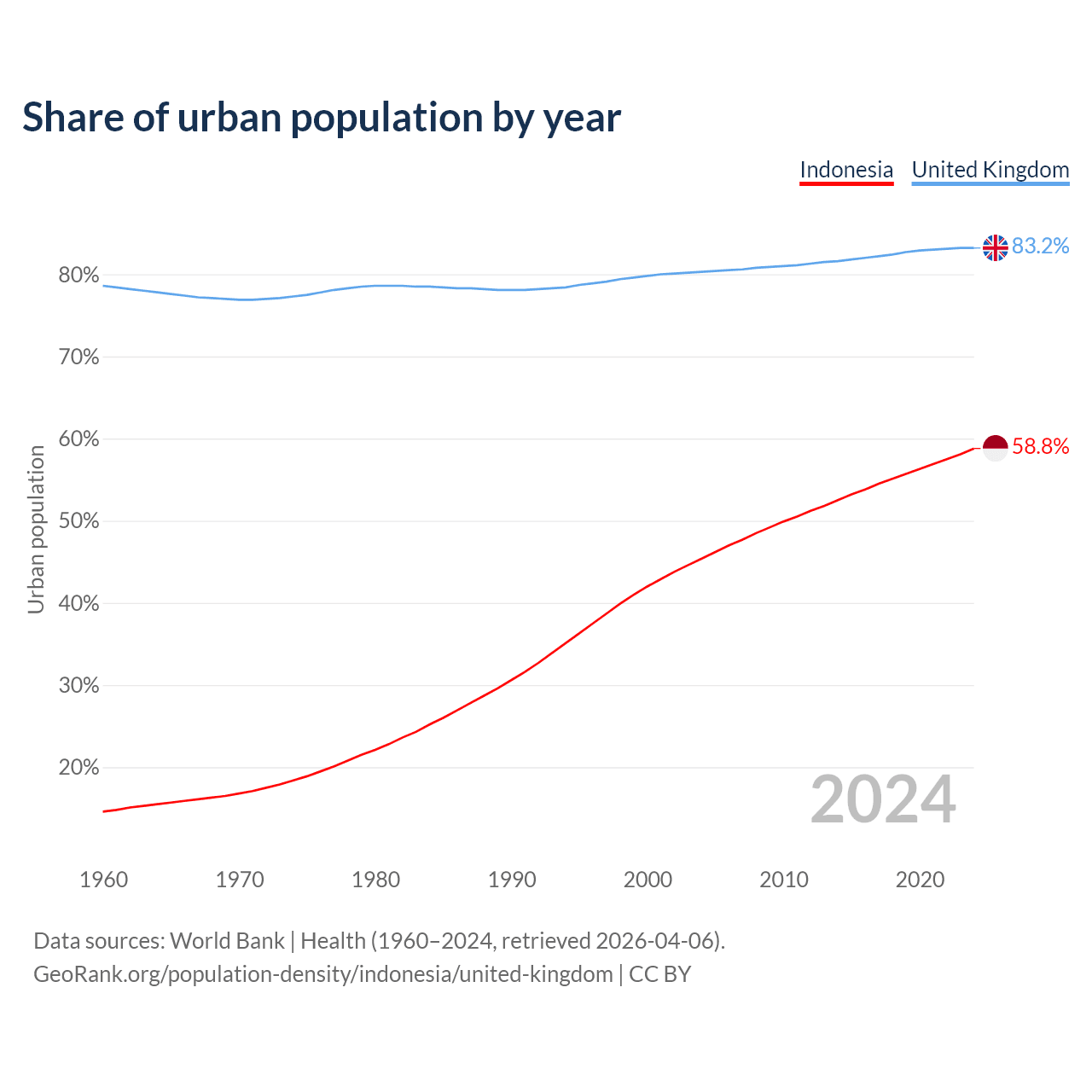 From 2004 to 2024, the share of urban population changed from 45.4% to 58.8% in Indonesia and from 80.3% to 83.2% in the United Kingdom.