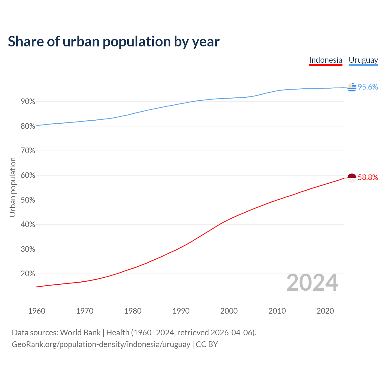 From 2004 to 2024, the share of urban population changed from 45.4% to 58.8% in Indonesia and from 91.8% to 95.6% in Uruguay.
