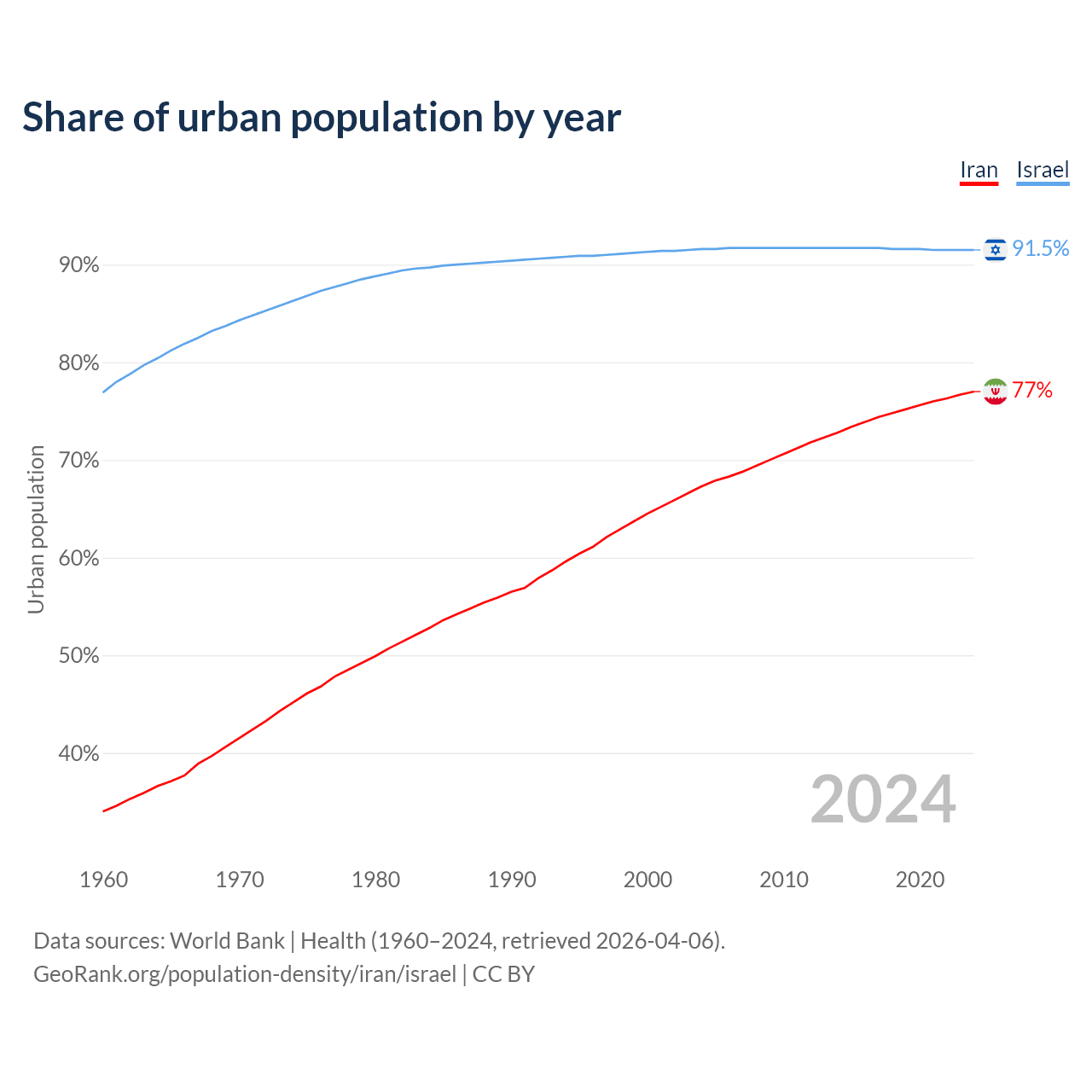 From 2004 to 2024, the share of urban population changed from 67.3% to 77% in Iran and from 91.6% to 91.5% in Israel.