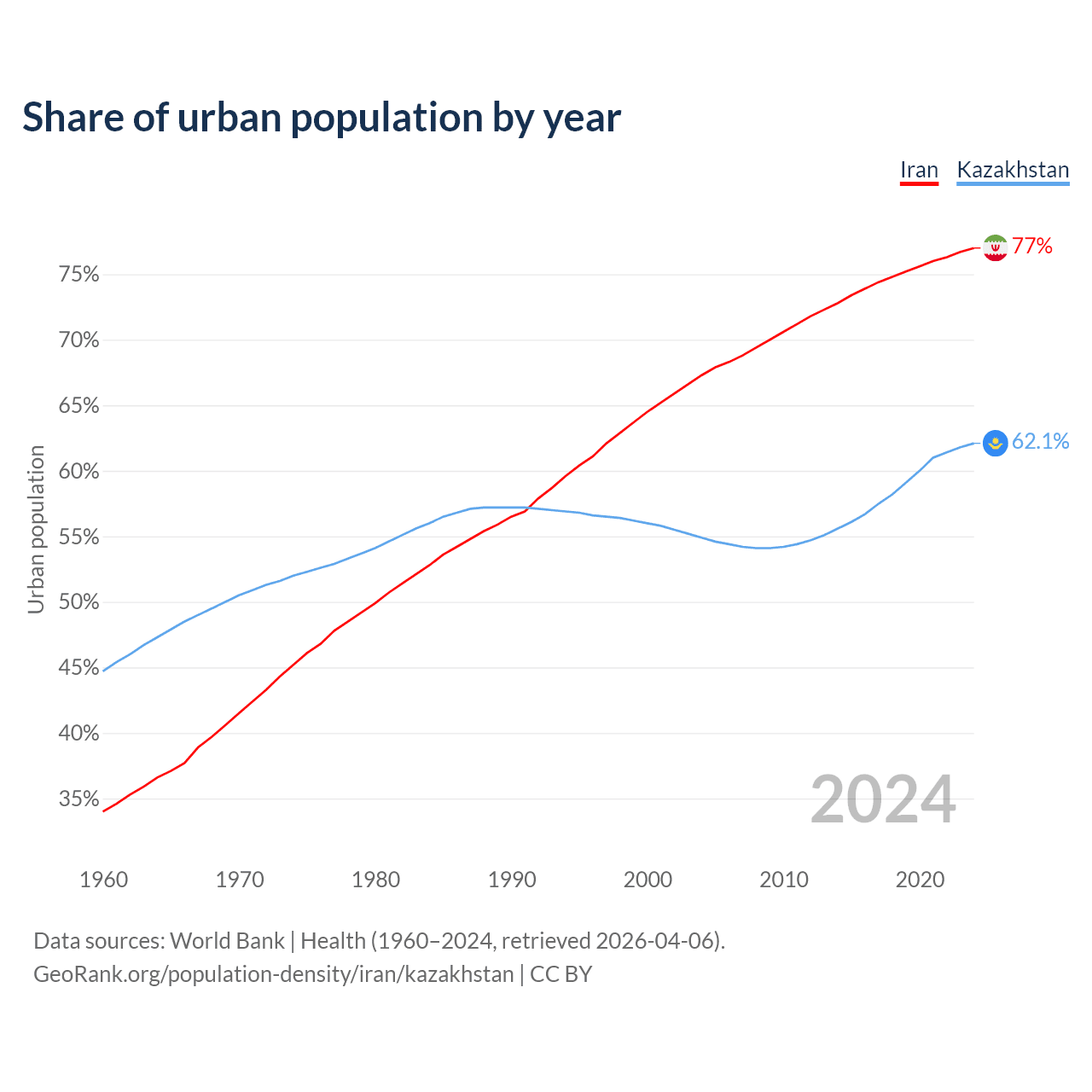 From 2004 to 2024, the share of urban population changed from 67.3% to 77% in Iran and from 54.9% to 62.1% in Kazakhstan.