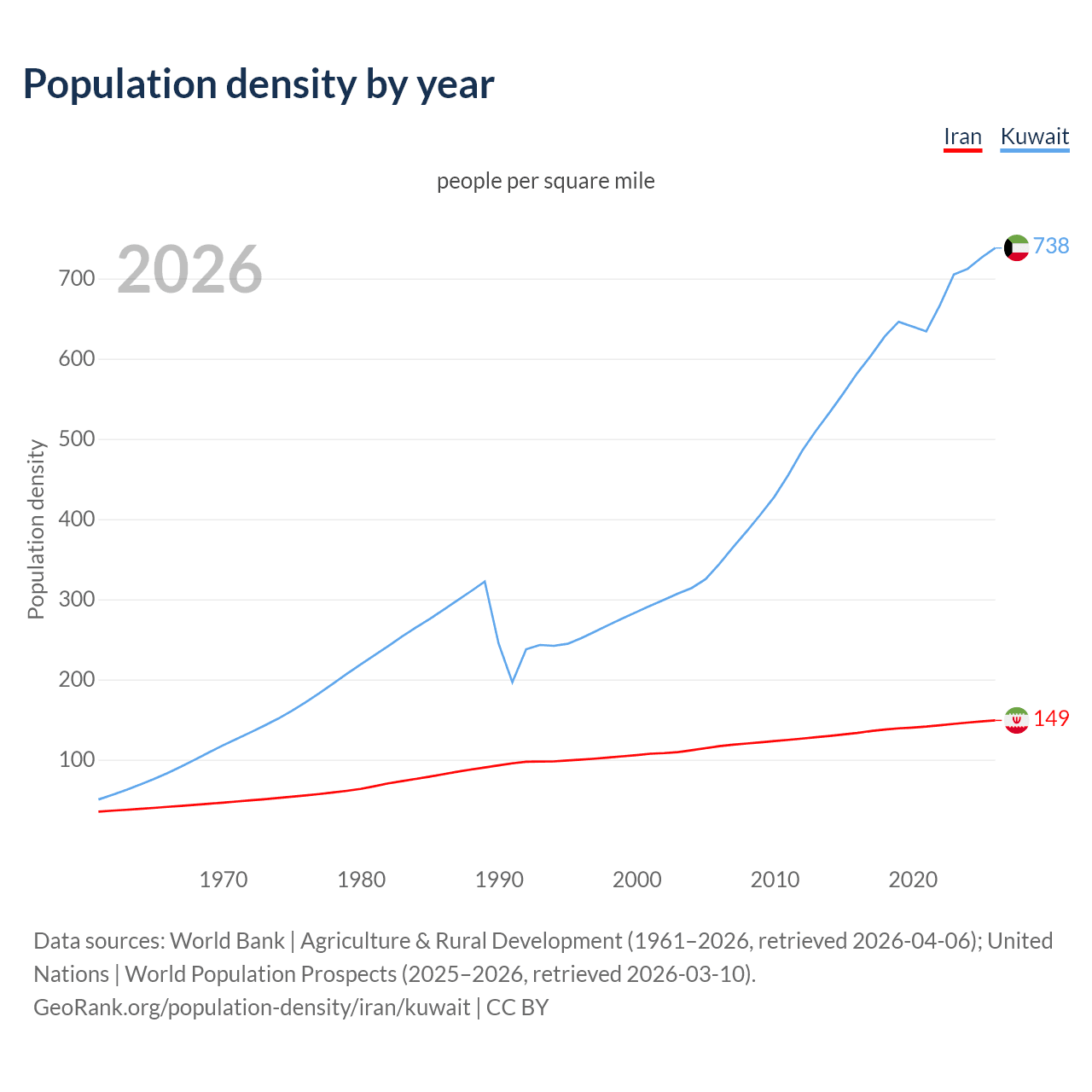 From 2006 to 2026, population density in Iran increased by 27.6%, compared to a 114.9% growth in Kuwait.