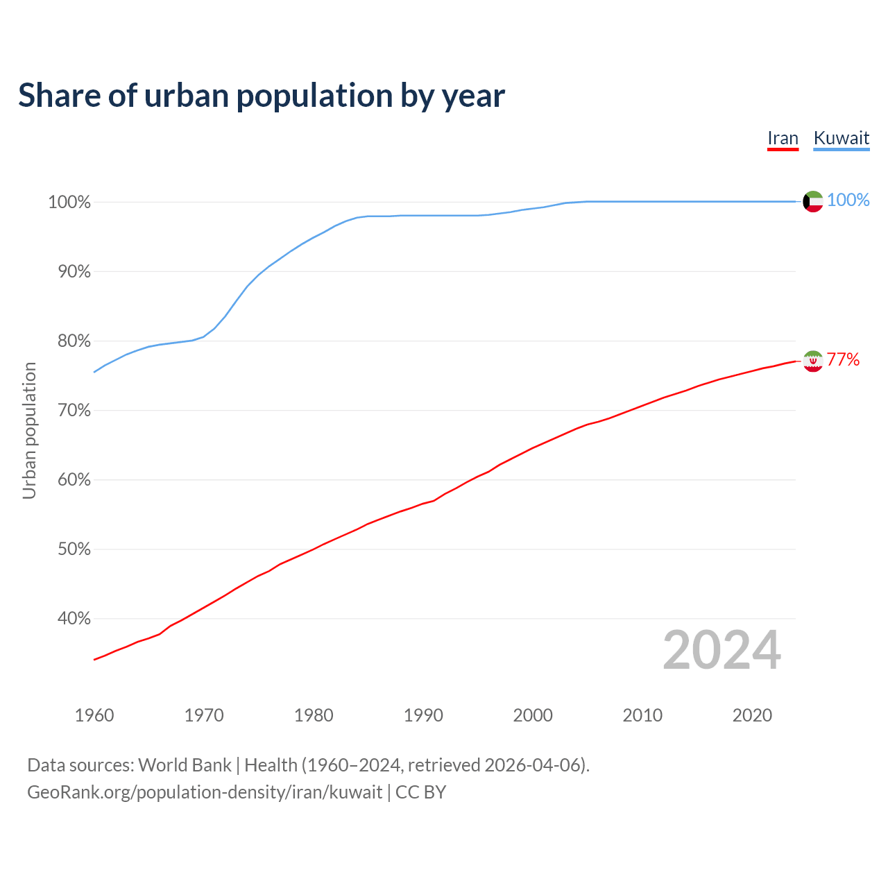 From 2004 to 2024, the share of urban population changed from 67.3% to 77% in Iran and from 99.9% to 100% in Kuwait.