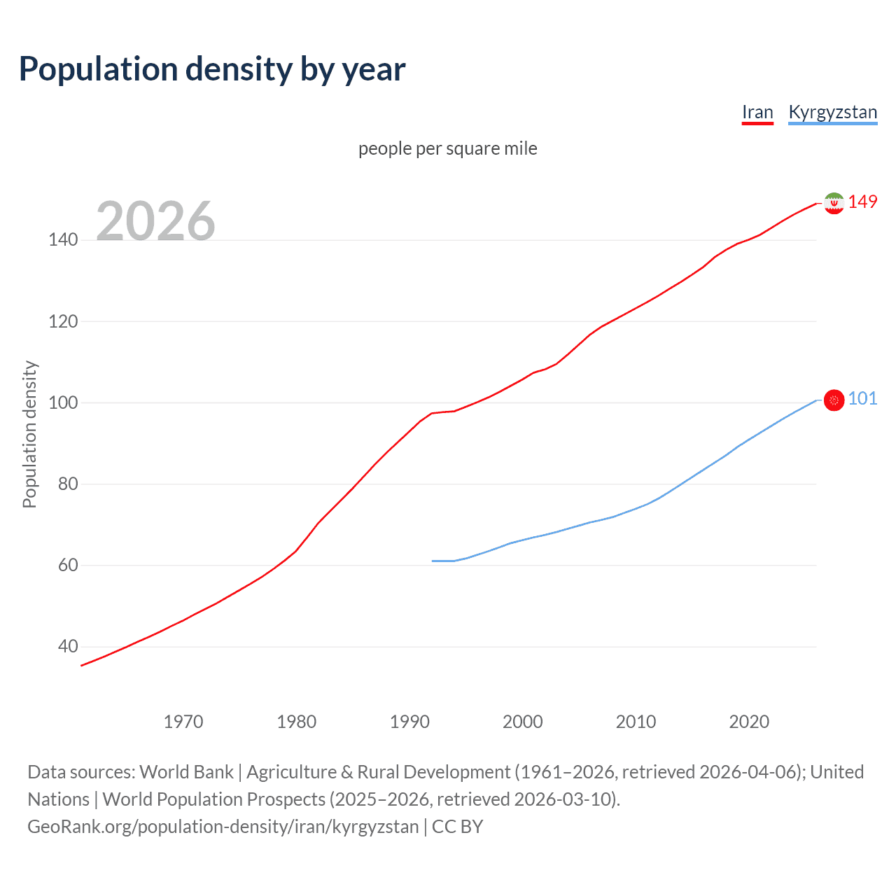 From 2006 to 2026, population density in Iran increased by 27.6%, compared to a 42.6% growth in Kyrgyzstan.