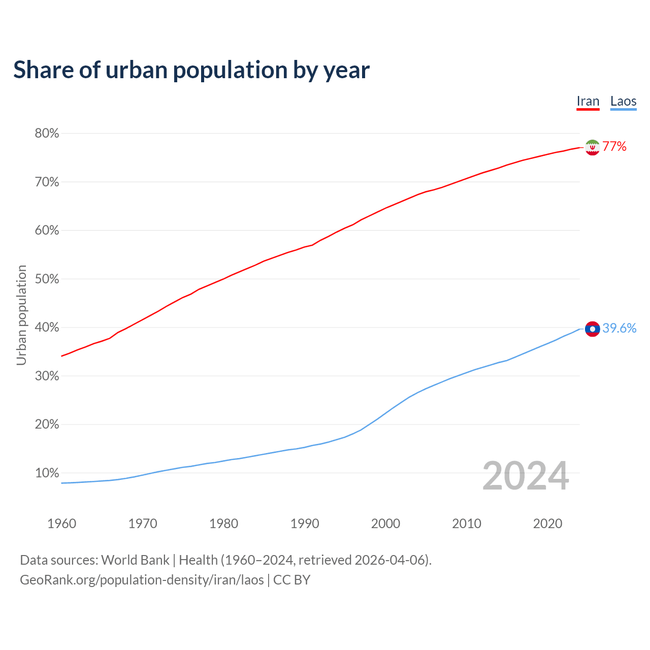 From 2004 to 2024, the share of urban population changed from 67.3% to 77% in Iran and from 26.5% to 39.6% in Laos.