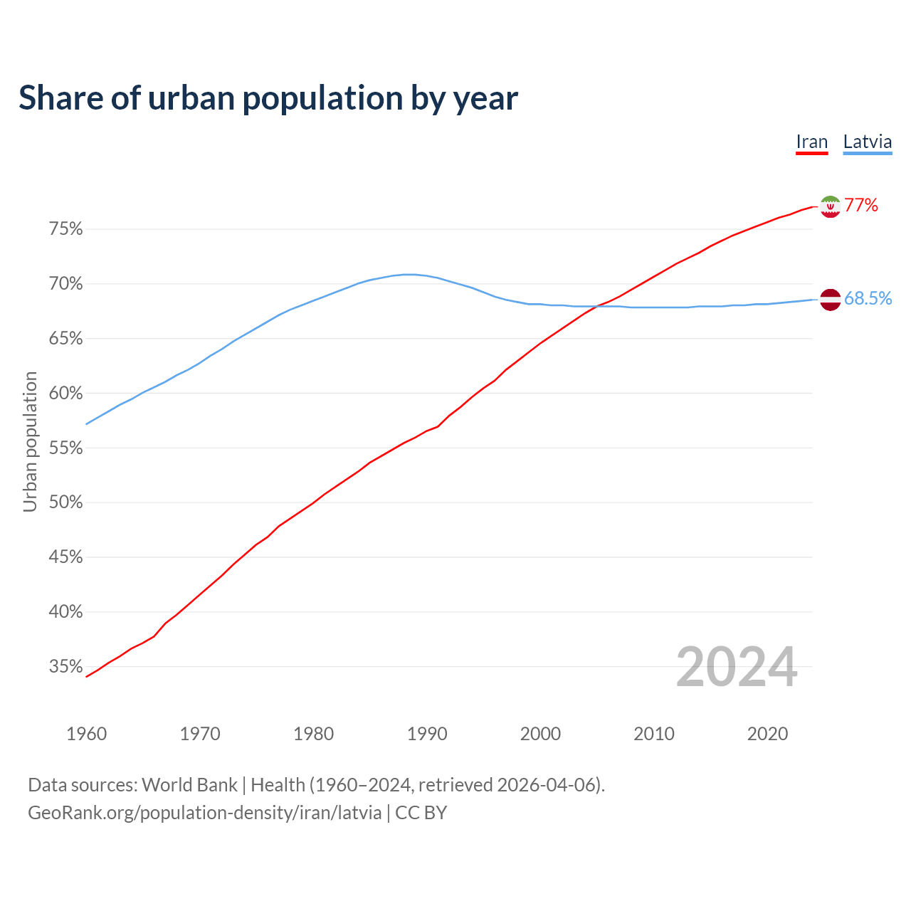From 2004 to 2024, the share of urban population changed from 67.3% to 77% in Iran and from 67.9% to 68.5% in Latvia.