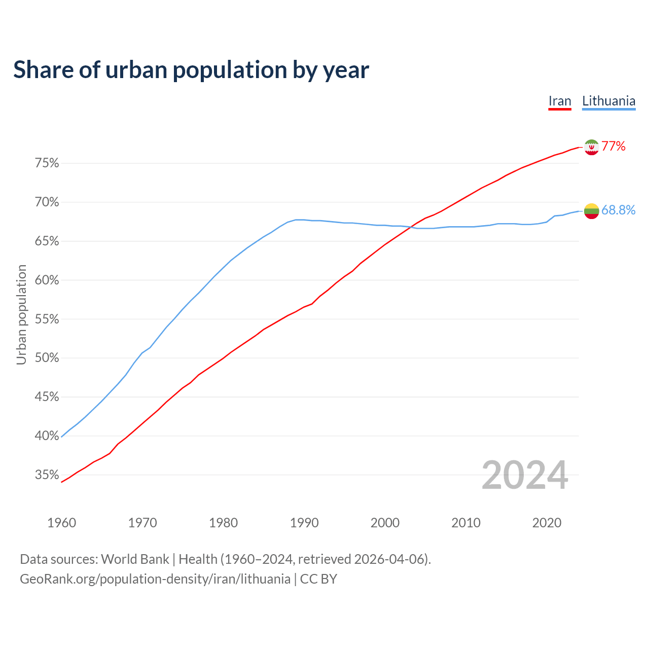 From 2004 to 2024, the share of urban population changed from 67.3% to 77% in Iran and from 66.6% to 68.8% in Lithuania.