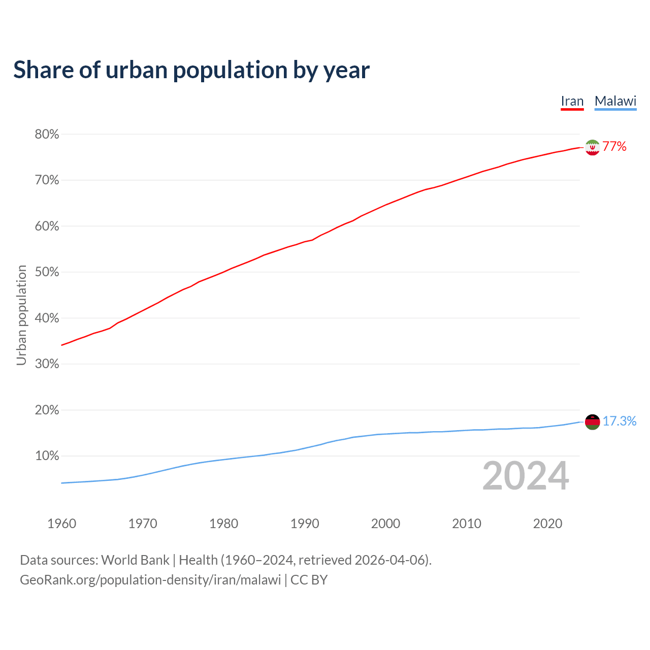 From 2004 to 2024, the share of urban population changed from 67.3% to 77% in Iran and from 15% to 17.3% in Malawi.