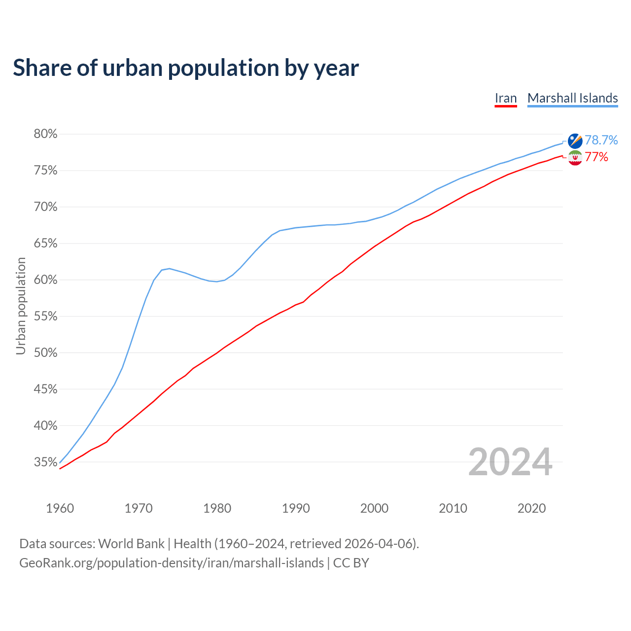 From 2004 to 2024, the share of urban population changed from 67.3% to 77% in Iran and from 70.1% to 78.7% in the Marshall Islands.