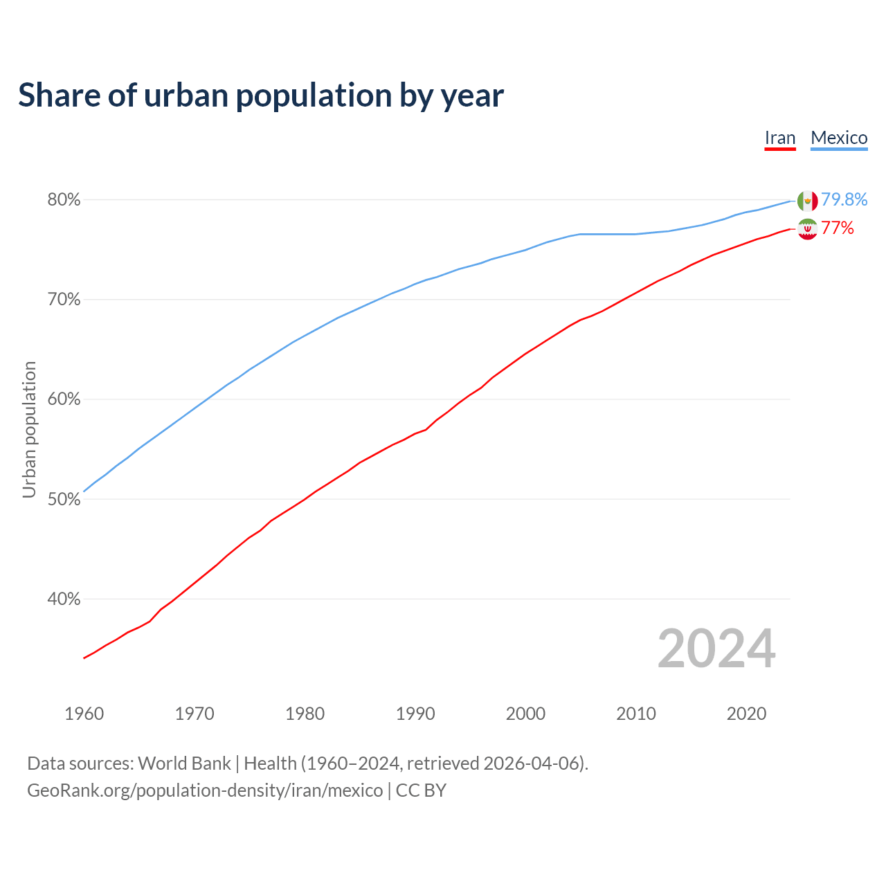 From 2004 to 2024, the share of urban population changed from 67.3% to 77% in Iran and from 76.3% to 79.8% in Mexico.