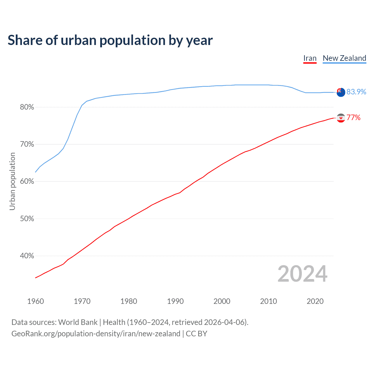 From 2004 to 2024, the share of urban population changed from 67.3% to 77% in Iran and from 85.9% to 83.9% in New Zealand.