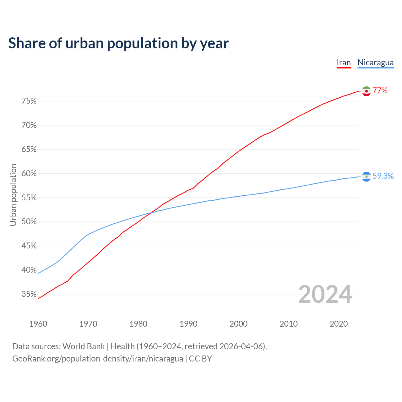 From 2004 to 2024, the share of urban population changed from 67.3% to 77% in Iran and from 55.8% to 59.3% in Nicaragua.