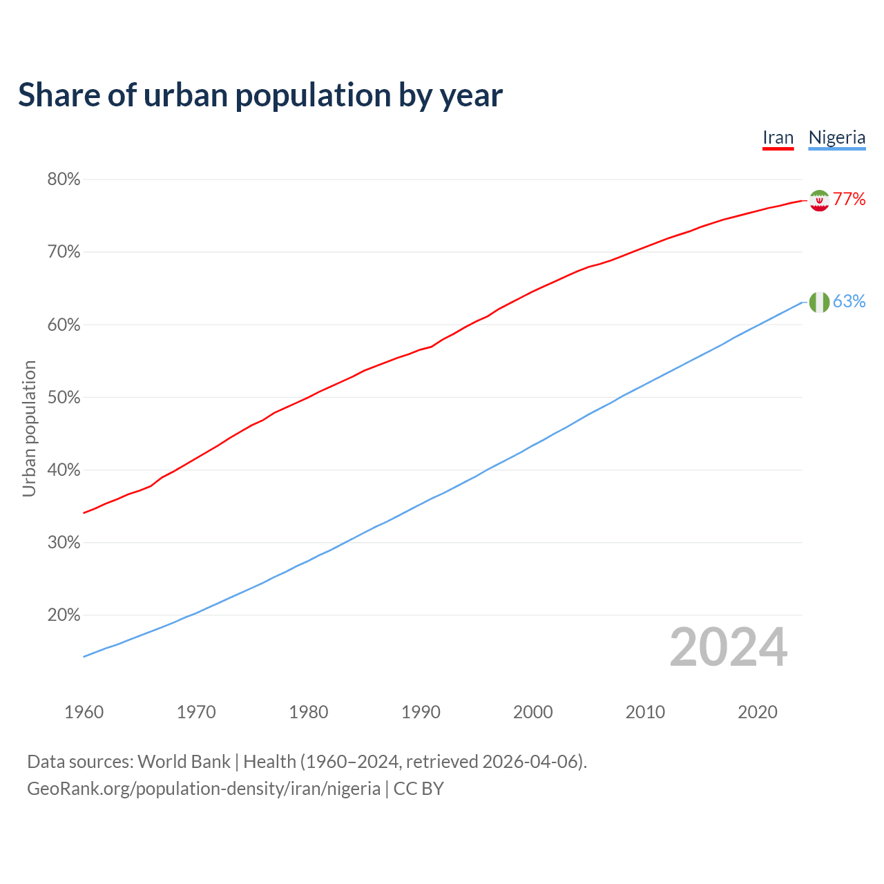 From 2004 to 2024, the share of urban population changed from 67.3% to 77% in Iran and from 46.7% to 63% in Nigeria.