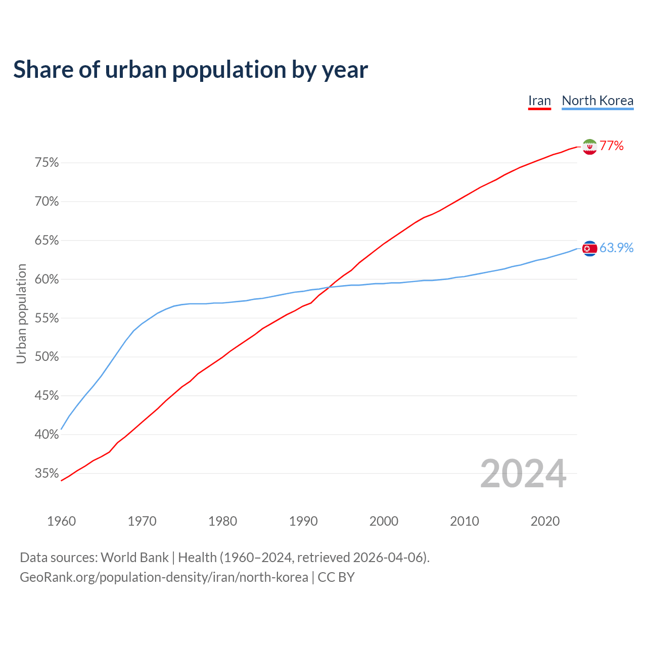 From 2004 to 2024, the share of urban population changed from 67.3% to 77% in Iran and from 59.7% to 63.9% in North Korea.