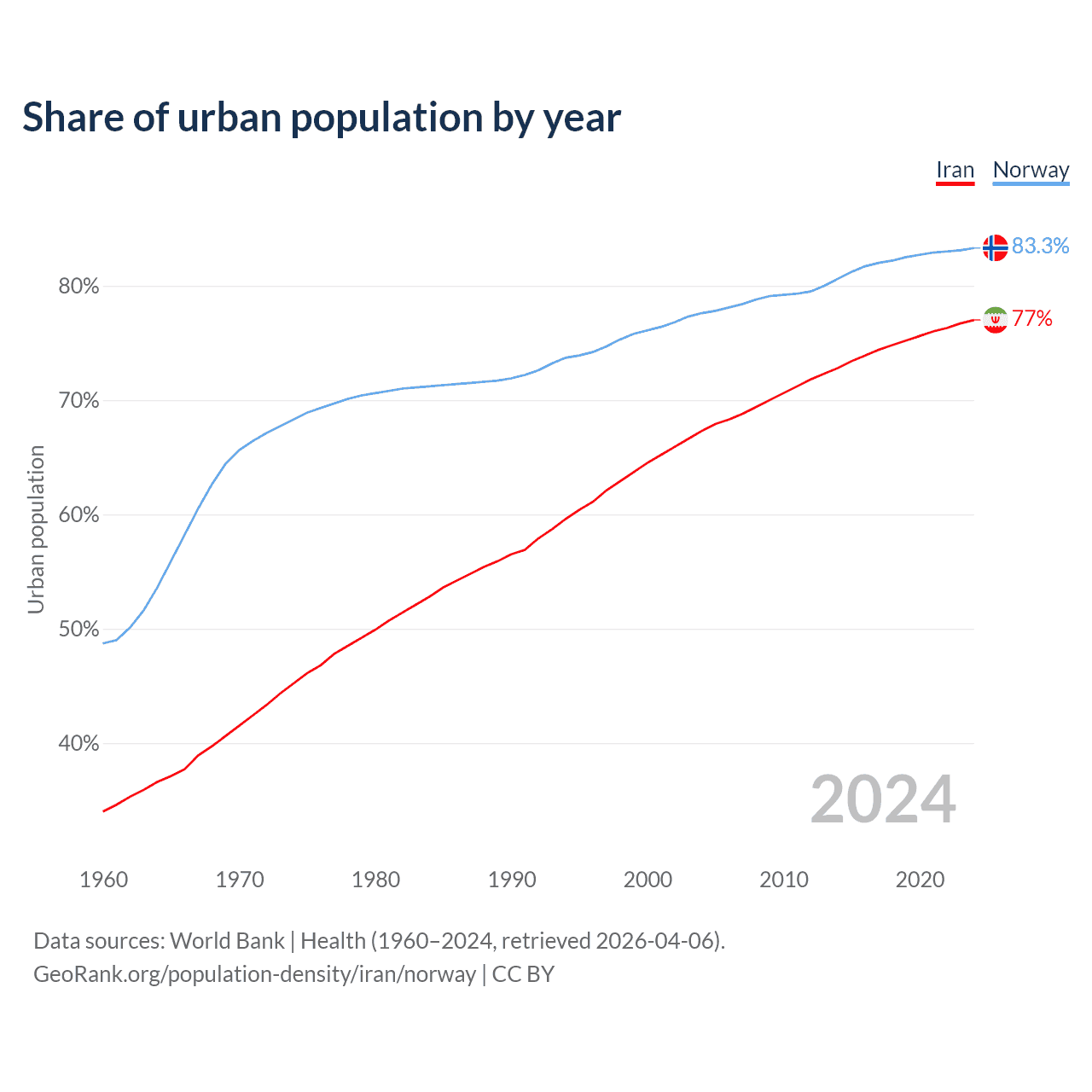 From 2004 to 2024, the share of urban population changed from 67.3% to 77% in Iran and from 77.6% to 83.3% in Norway.