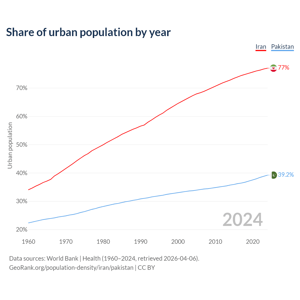 From 2004 to 2024, the share of urban population changed from 67.3% to 77% in Iran and from 33.7% to 39.2% in Pakistan.