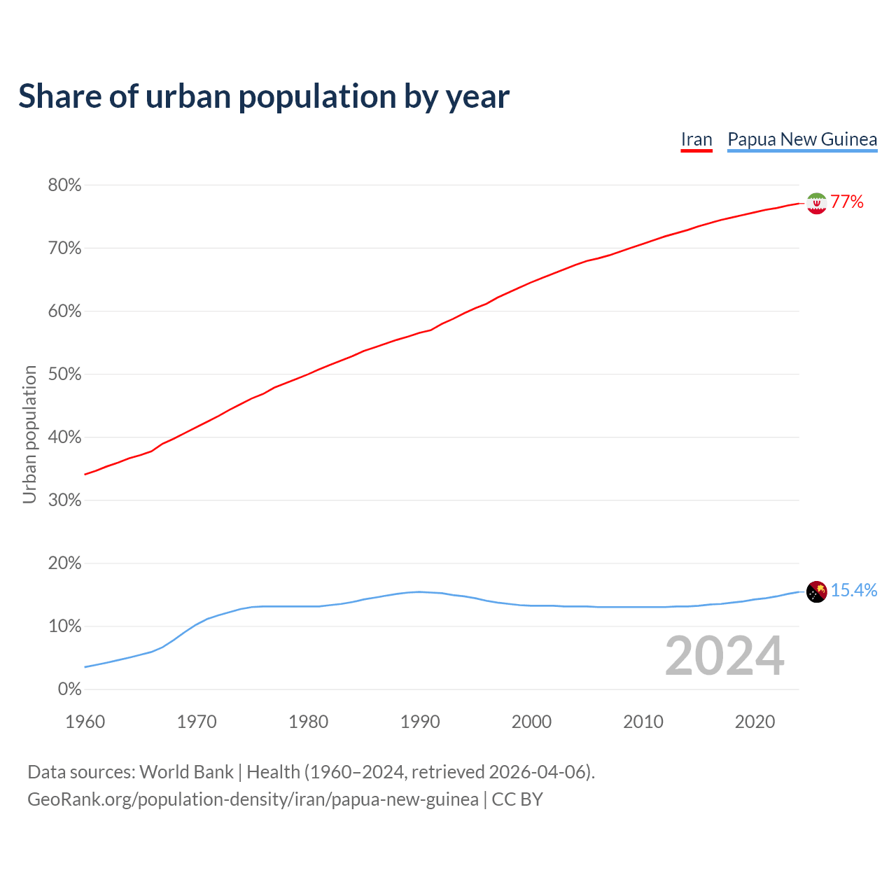 From 2004 to 2024, the share of urban population changed from 67.3% to 77% in Iran and from 13.1% to 15.4% in Papua New Guinea.