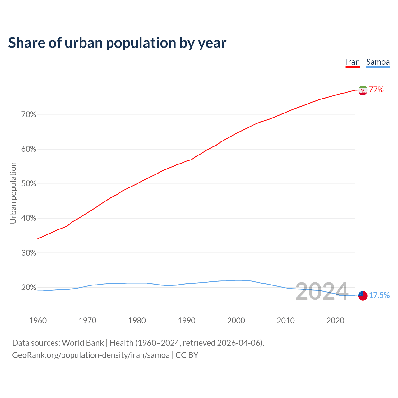 From 2004 to 2024, the share of urban population changed from 67.3% to 77% in Iran and from 21.5% to 17.5% in Samoa.