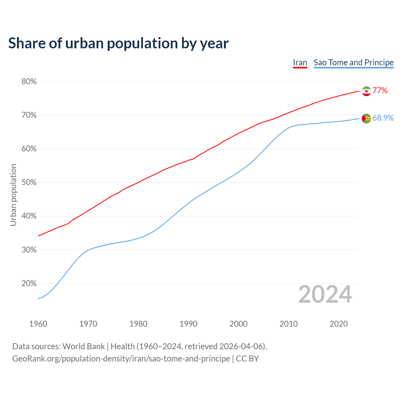 From 2004 to 2024, the share of urban population changed from 67.3% to 77% in Iran and from 57.9% to 68.9% in Sao Tome and Principe.