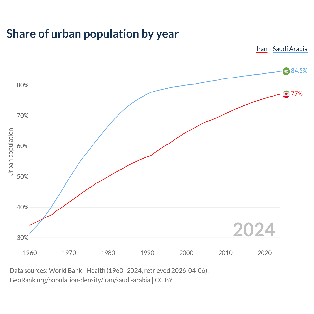 From 2004 to 2024, the share of urban population changed from 67.3% to 77% in Iran and from 80.8% to 84.5% in Saudi Arabia.