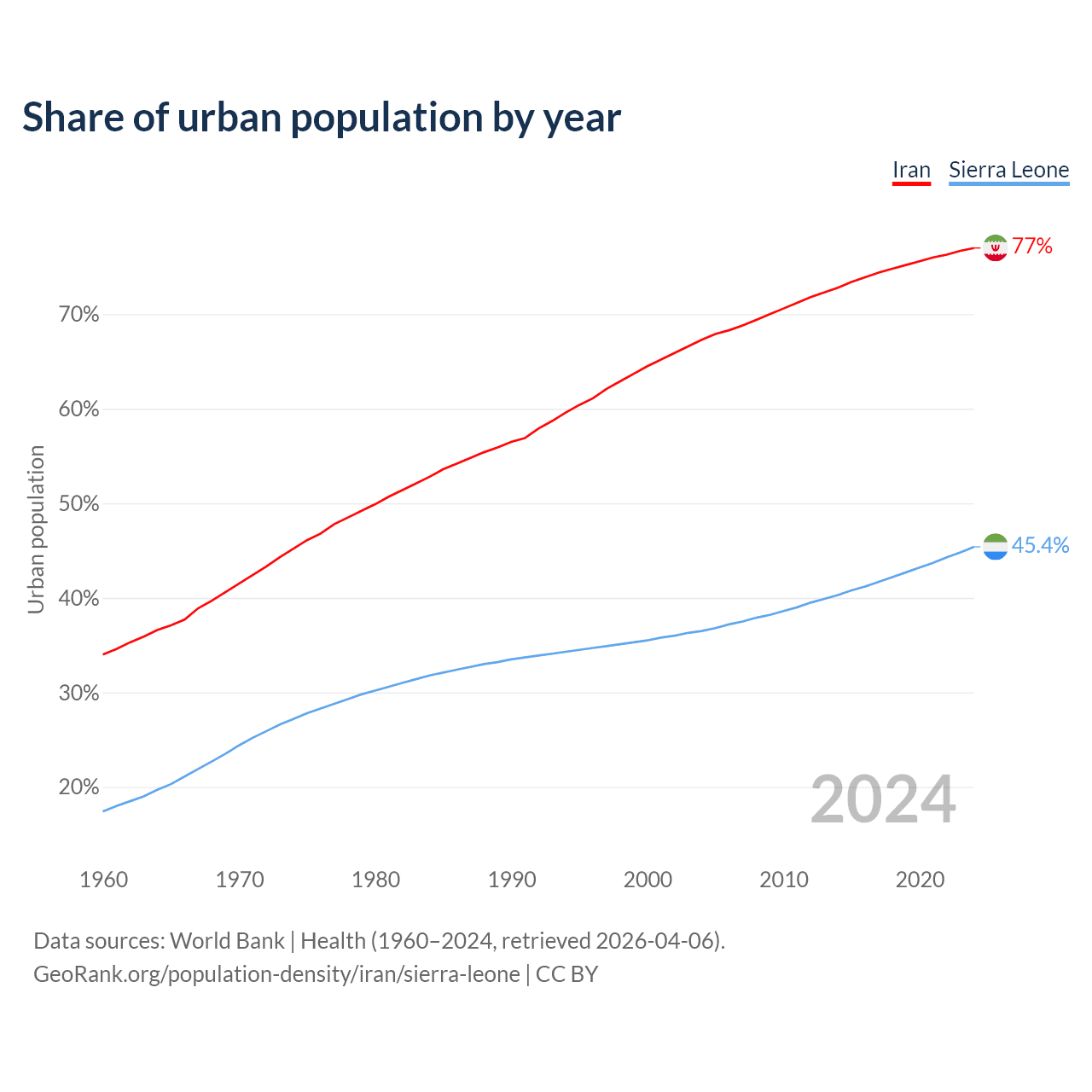 From 2004 to 2024, the share of urban population changed from 67.3% to 77% in Iran and from 36.5% to 45.4% in Sierra Leone.
