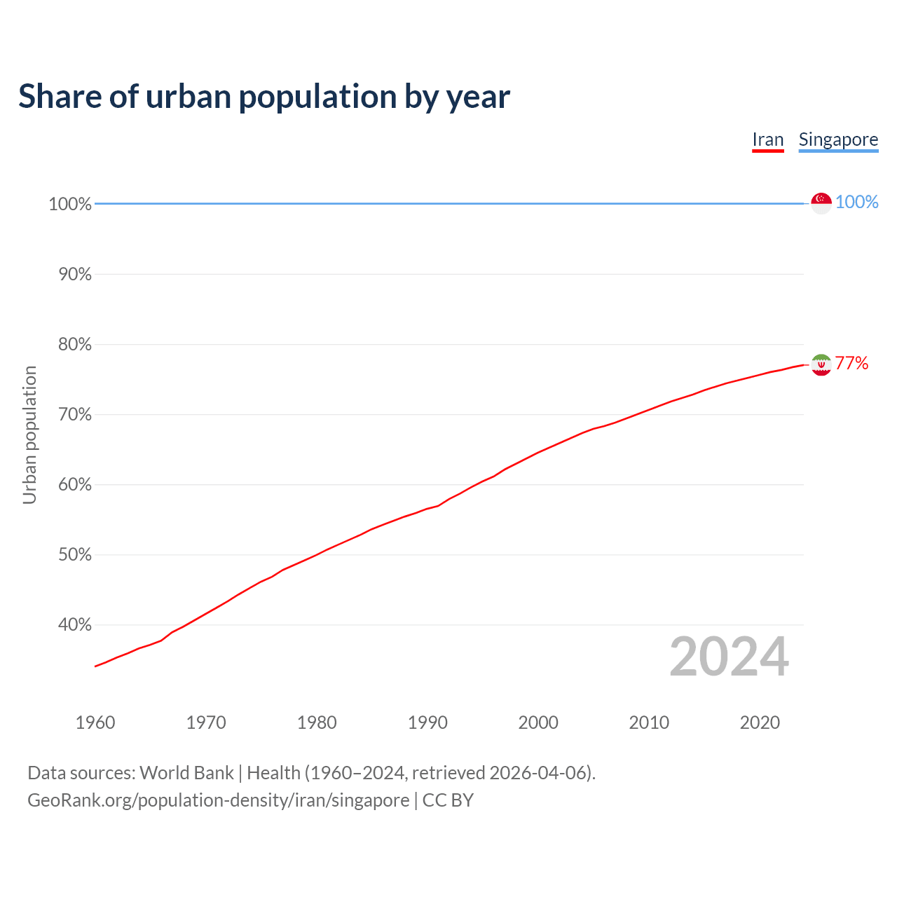 From 2004 to 2024, the share of urban population changed from 67.3% to 77% in Iran and from 100% to 100% in Singapore.