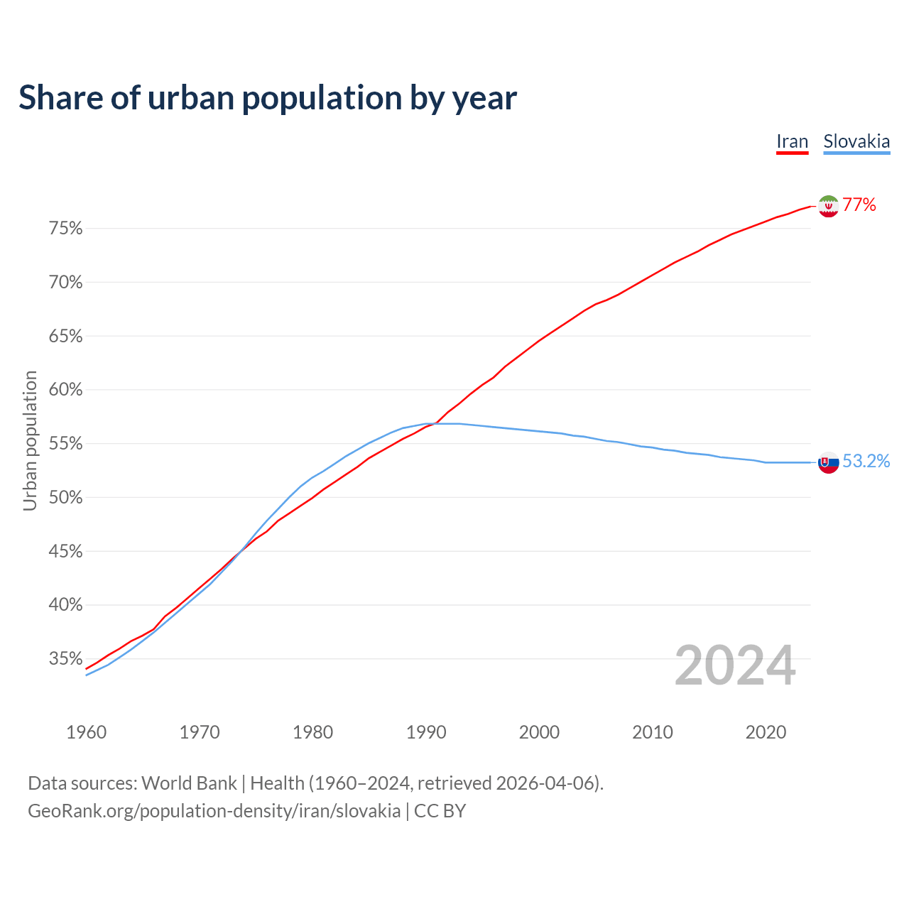 From 2004 to 2024, the share of urban population changed from 67.3% to 77% in Iran and from 55.6% to 53.2% in Slovakia.